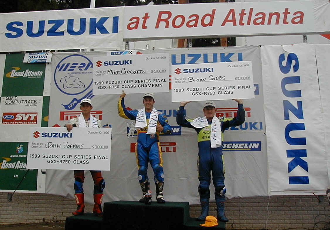 Mike Ciccotto Florida Full Spectrum gsxr750 and TL1000r 1999 Suzuki Cup GSX 750r AND Open Class Champion. Mike, simply, always a contender at Road Atlanta - especially in the rain! Click on your browser's "view image" to see why he's smiling! #1 1999 Suzuki Cup Open Class #1 1998 Suzuki Cup GSX |
